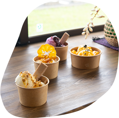 亜熱帯気候ならではの、奄美の果物(奄美たんかん、奄美パッションフルーツ、奄美マンゴー、奄美すもも、奄美ドラゴンフルーツ等)をふんだんに利用し、夏場は冷たいスイーツやジュース、冬場は温かいデザートをご用意しています。