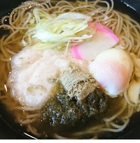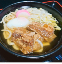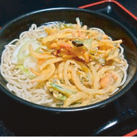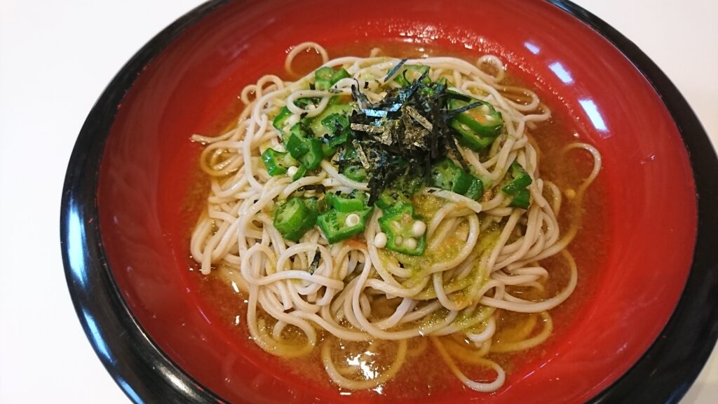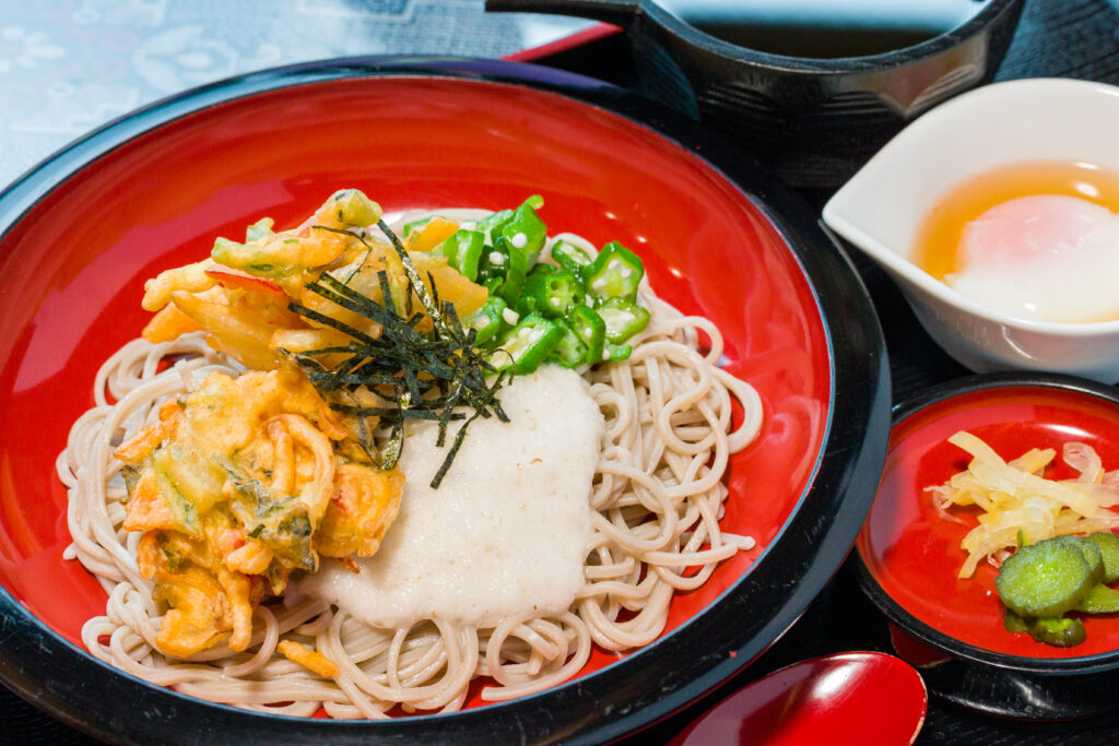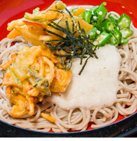 ハンダマ、シマ桑、長命草などの薬膳野菜かき揚げ、山芋とろろ、刻みオクラを乗せて、温泉卵を添えた冷たい一品です。そば・うどんのどちらかを、お選び下さい。