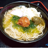 奄美の入り江で収穫された天然のアオザと、紀州南高梅をふんだんに使った、スッキリと爽やかな一品。そば・うどんのどちらかを、お選び下さい。