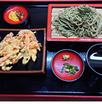 奄美住用産の健康食材【シマ桑】【シマアザミ】【長命草】を麺に練り込んだ、当店独自の「薬膳そば」と、ハンダマ、シマ桑、長命草などの「薬膳野菜かき揚げ」をセットにしました。