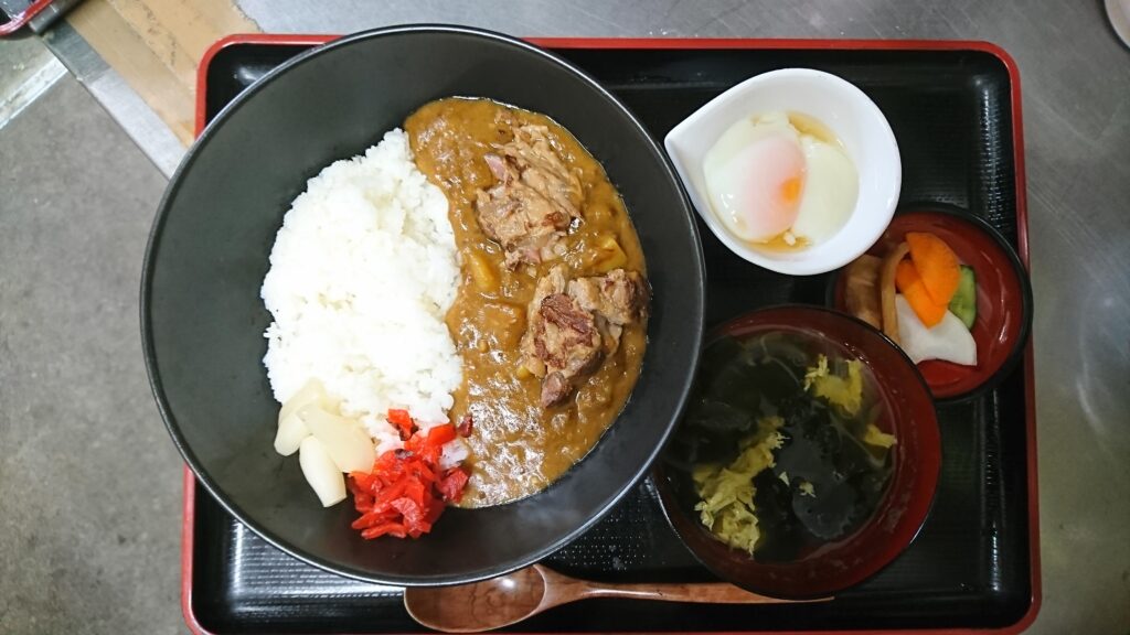 トロトロに煮込んだ黒豚なんこつをドーンと載せて、温泉卵、白ネギ、カマボコをトッピングしました。
