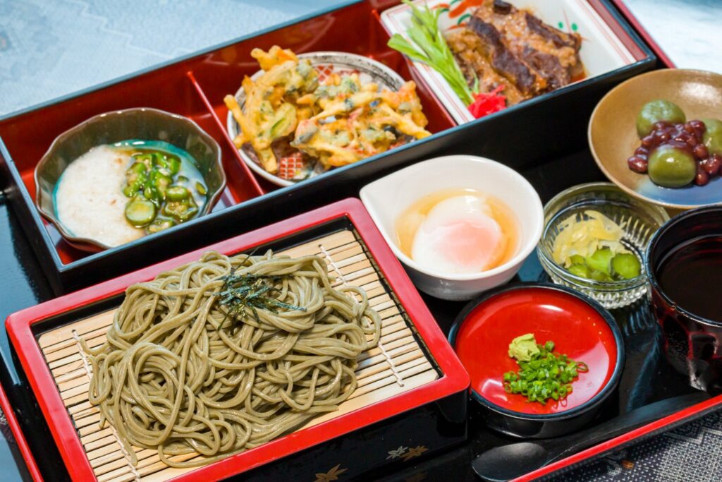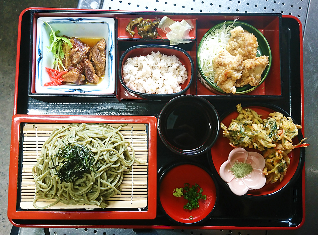 薬膳そば、そばの実ご飯(黒米ご飯に変更可)、薬膳かき揚げ、黒豚なんこつ、鶏の唐揚げ、漬物のセット。
