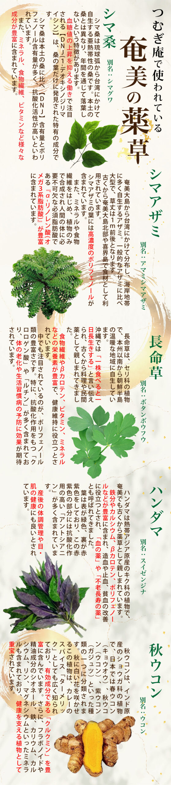 ヨモギやツワブキなど、郷土料理や特産品などの伝統的な食材として利用されているものから、長命草やシマ桑、シマアザミなど、近年の科学的な分析によって、その含有成分から注目され始めたものまで、他には無い「島の宝」ともいうべき自然の素材が、そこかしこに眠っているのです。