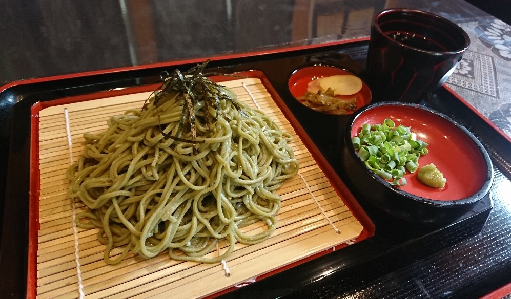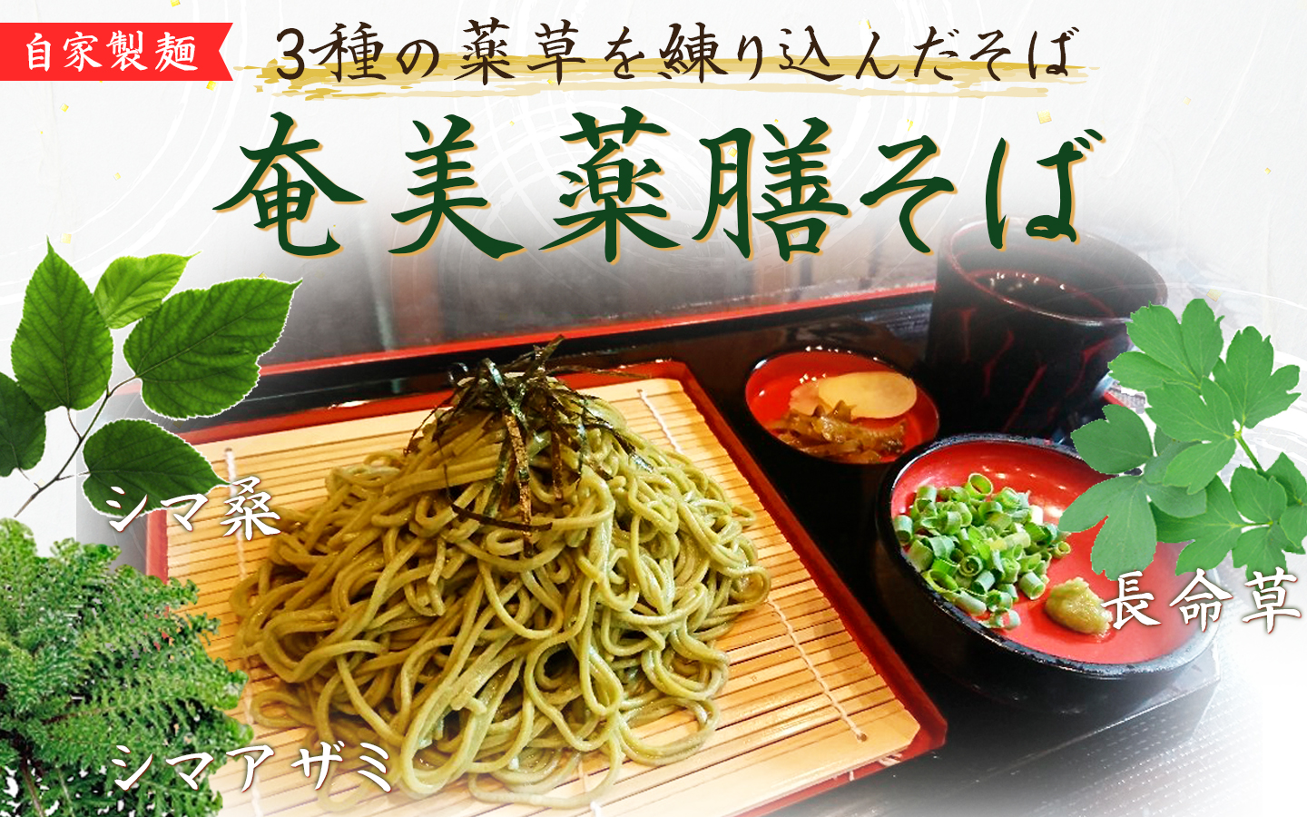 奄美住用産の健康食材【シマ桑】【シマアザミ】【長命草】を麺に練り込んだ、当店独自の「薬膳そば」です。
