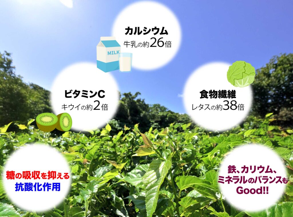 南西諸島に分布する「シマ桑」には、食物繊維、カルシウム、鉄分などの栄養素が豊富です。また、本土のクワと比べ糖質の吸収を抑える「DNJ」や、抗酸化作用がある『ポリフェノール」の含有量が多く、ミネラルバランスも良いことから新たな健康食材として注目されています。